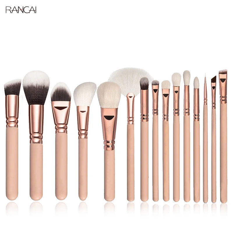 Продавец предлагает набор синтетических кистей для макияжа из 15 штук в трех разных цветовых вариациях.